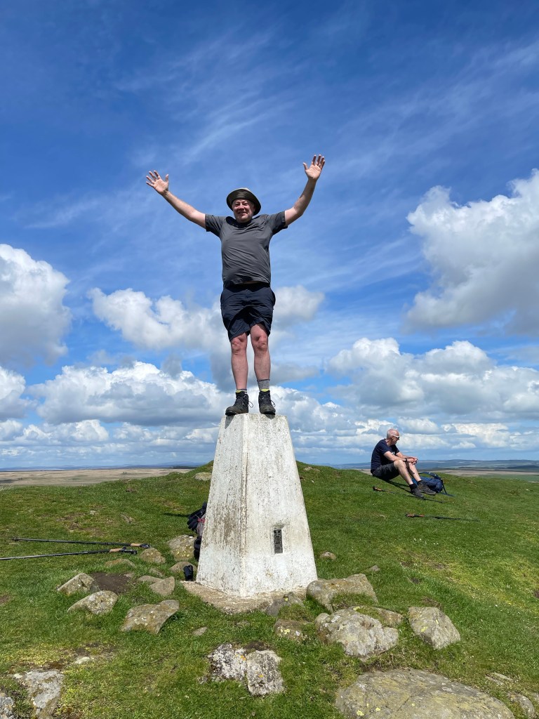 After even further climbing we arrived at the highest point on top of the ridge and were presented with an Ordnance Survey Trig point, there was one among us who wanted to show us that he could stand atop the trig point. While I was ultimately impressed with the fact that John could make the climb, it was touch and go for a while and could have ended in tears!